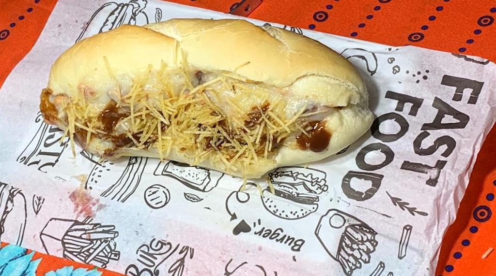 EL PORTEÑO – Eita Toscana: Baguete com toscana, purê de macaxeira, chips de bacon e batata palha.