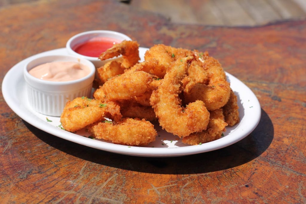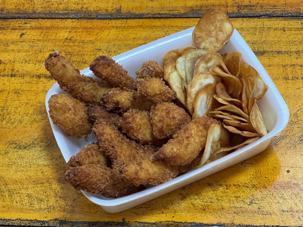 GALETERIA ANDRADE – Danado de Bom: Tiras de filé de tilápia empanadas na farinha panko, acompanhadas de chips de batata doce e maionese cítrica.