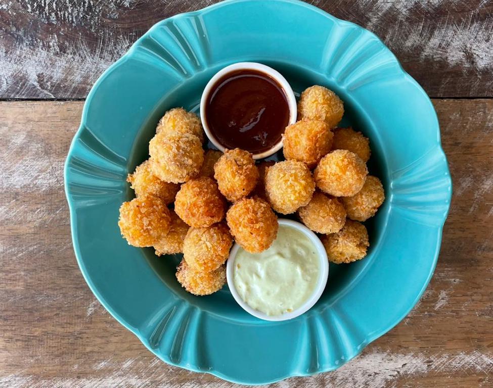 MESTRE CUCA – Pipoca de Frango Caipira: Bolinhos crocantes de frango cozido desfiado com verdurinhas. Molho do cozido, purê de macaxeira, queijo coalho ralado e muçarela para dar um toque final. São servidos com molho barbecue de goiabada e maionese de cheiro verde.