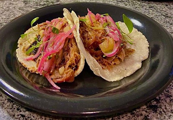 DIVINA GULA – Tacos de lombinho defumado: Tortilla de macaxeira, copa lombo de porco defumada, vinagrete de abacaxi, cebola crioula e coentro.