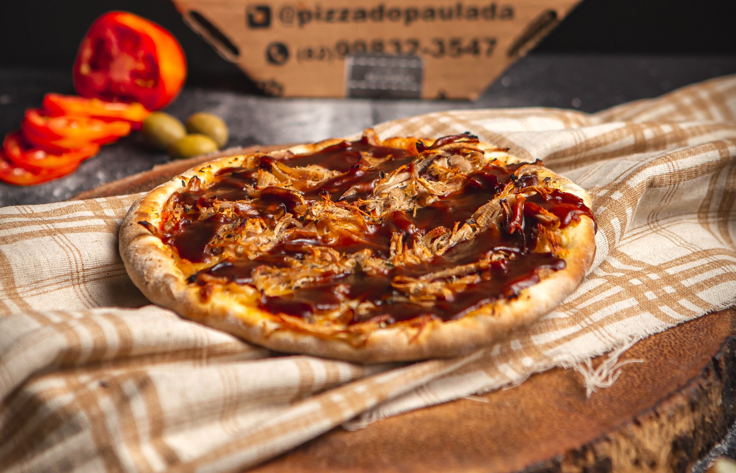 PIZZA DO PAULADA – Paulada Alagoana : Na massa do Paulada, molho exclusivo com tomates selecionados, muçarela bem derretida e pernil suíno bem desfiado, com uma camada bem cremosa de barbecue finalizada com orégano.