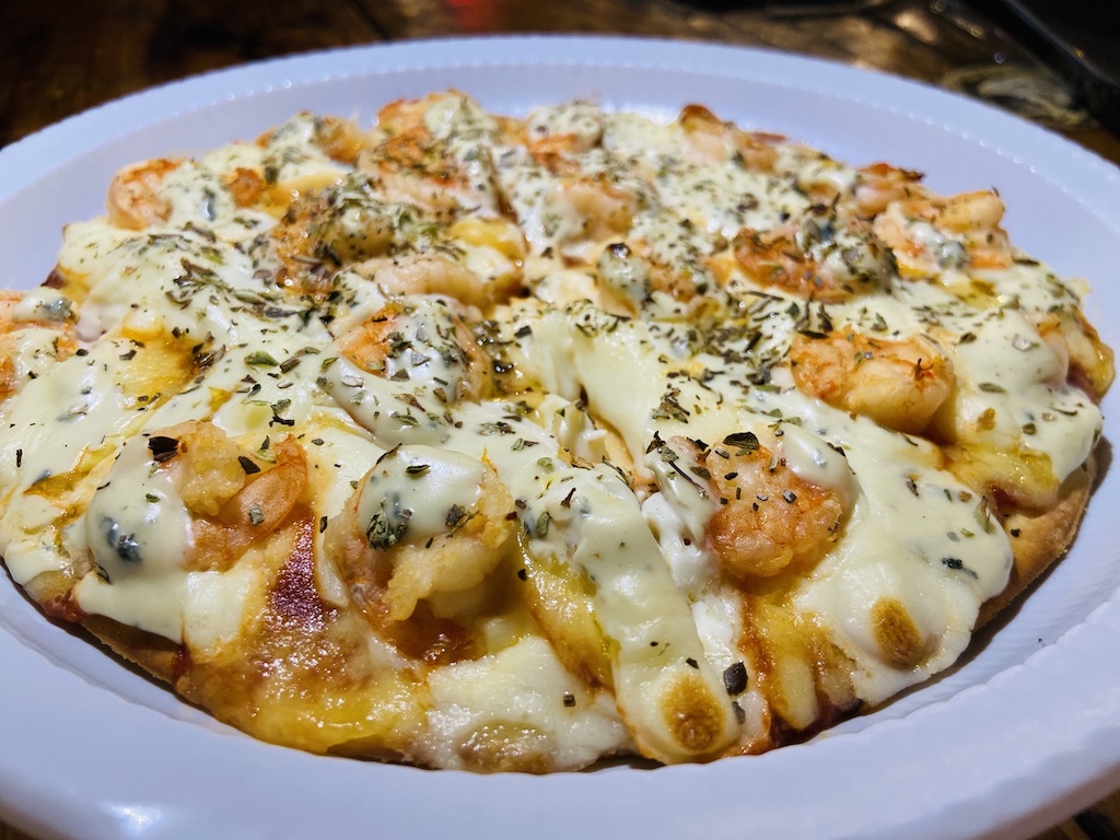 PIZZARIA CABRAL – Camarão Amostrado: Massa fininha e crocante, molho de tomate, queijo muçarela, catupiry, camarões salteados na manteiga de garrafa e nosso molho especial de gorgonzola.