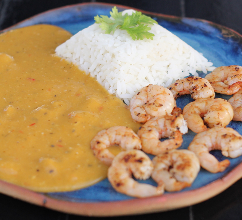 MASSAGUEIRINHA – Camarão Massagueirinha: Camarão no creme de queijo do reino com tomate cereja flambadas e torradas na manteiga da terra.