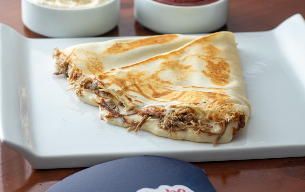 SUCREEPE – Sucreepe das Alagoas: Massa de crepe fininha e crocante com carne de sol desfiada deitada numa cama de muçarela e finalizada com redução de acerola apimentada.