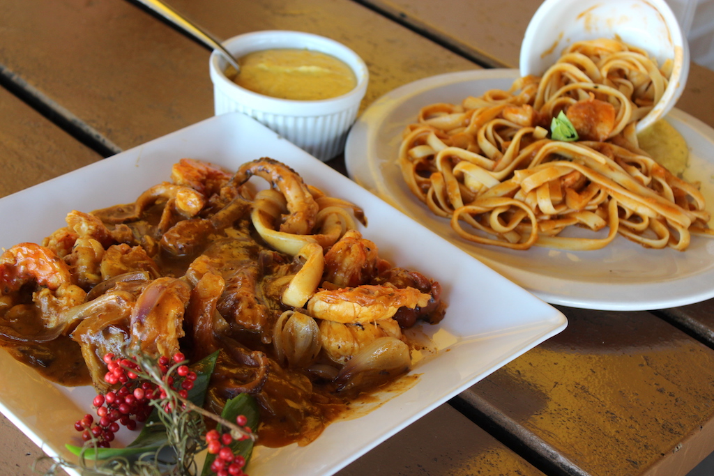 Restaurante Mama Pereira misturou lagosta, camarão, lula, polvo e serviu com massa e purê de banana