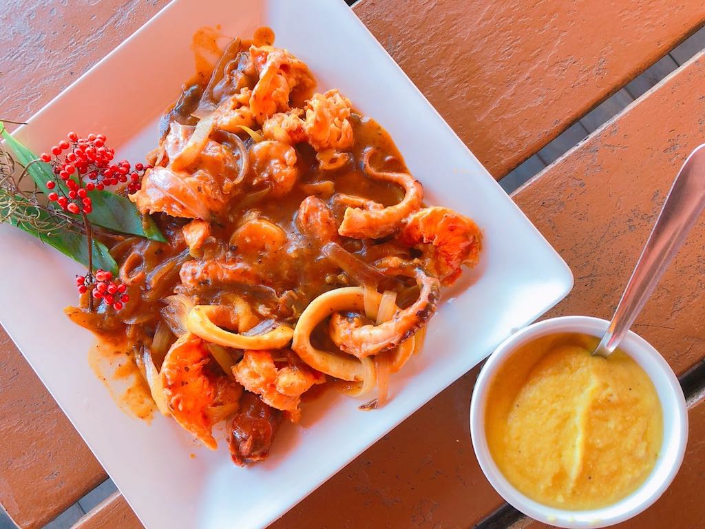 Receptivo Japaratinga – Polvo refogado em mix de verduras, azeitonas, creme de leite e arroz branco. Av. Napoleão Rodrigues da Silva, 150 – Centro.
