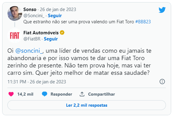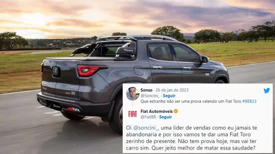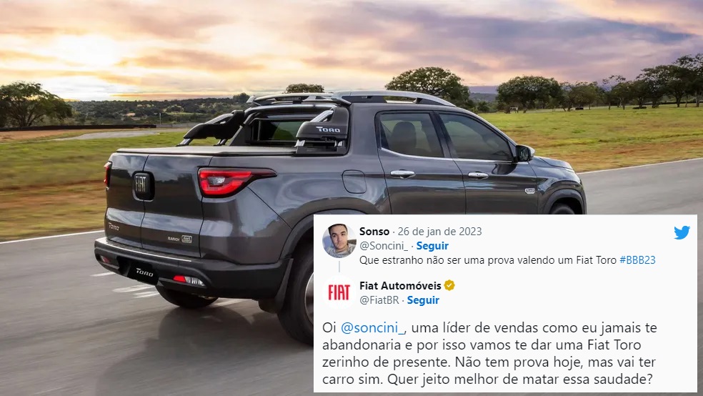Eis que surgiu esse comentário: “Que estranho não ser uma prova valendo um Fiat Toro #BBB23”