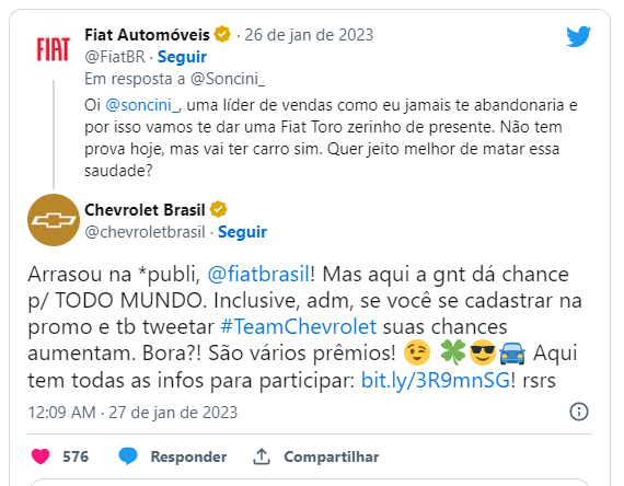Mas a Fiat não ficou para trás, por estar presente nos últimos 22 anos no programa a lembrança da marca no reality ainda é forte e foi só esperar uma reação de algum internauta no Twitter para contra-atacar a concorrente.