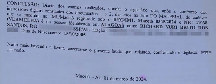![]() Pai de Richard mostrou documento do IML atestando que a identidade do filho foi confirmada após exame (Foto: Reprodução / TV Pajuçara) |