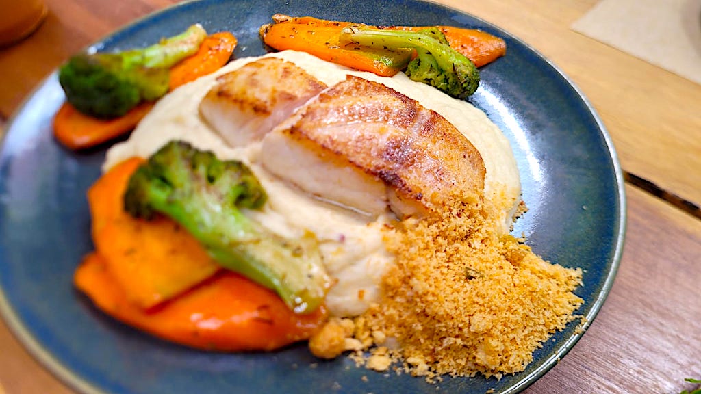 Almoço executivo da Grano Padaria: Peixe com purê de batata e legumes grelhadas