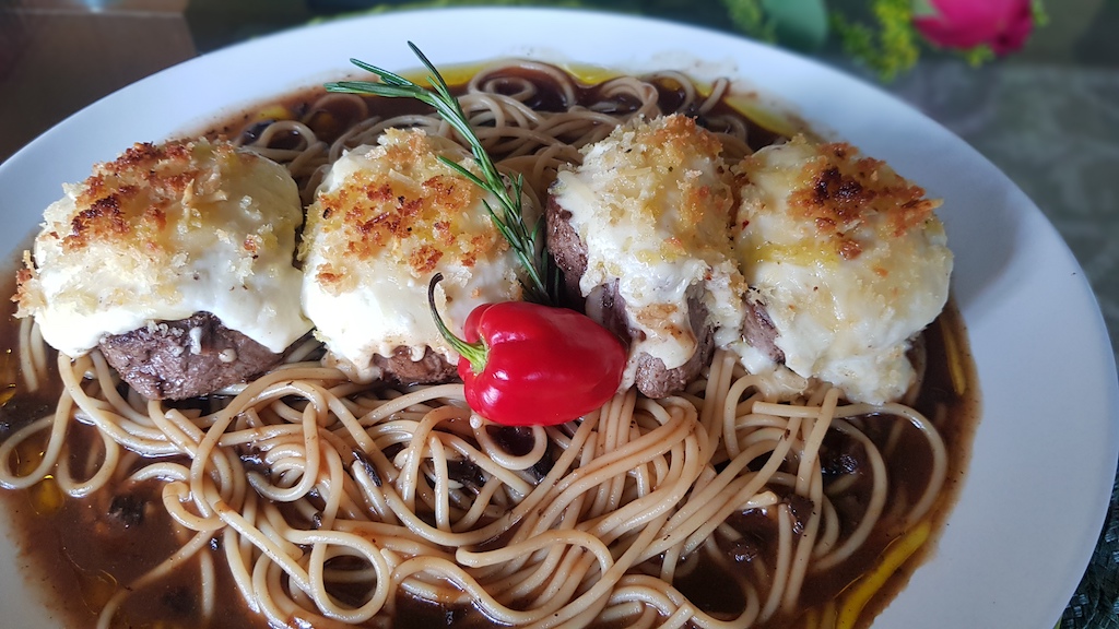 Filés gratinados ao queijo gruyère com crocante de farinha panko, escoltados pelo espaguete ao molho funghi
