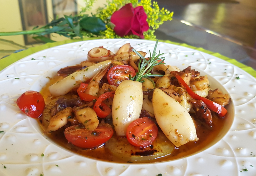 Frutos do mar a italiana: lula, polvo, camarão, tomates com batata doce grelhada no molho de azeite
