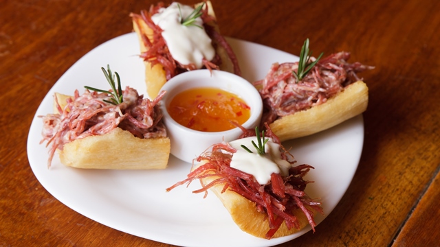 Bodega do Sertão:Barca de macaxeira recheada com charque ao creme de queijo acompanhada com geleia de pimenta. Av. Júlio Marques Luz, 62- Jatiúca – (82) 3327-4446.