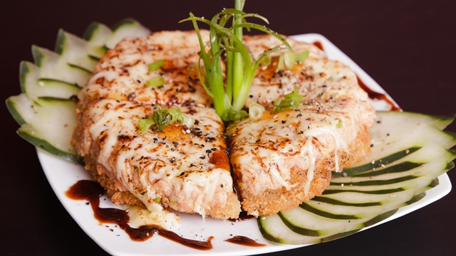 Osaka Culinária Oriental: Pizza Oriental de Shari envolto com farinha panko, recheado de salmão grelhado com mussarela levemente maçaricada e um toque de molho tarê/ Av. Pretestado Ferreira Machado, 630 sala 05 – Jatiúca – (82) 3432-4007.