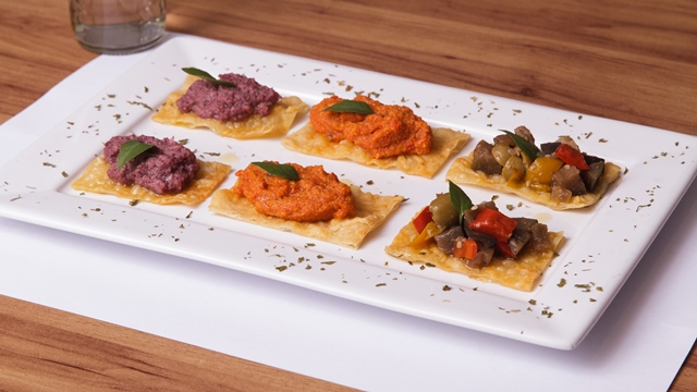 Sabatelli: Trio de Crostini com massa crocante de pizza branca (crostini). Acompanhada pelos molhos: pesto de azeitpna, sardella, e berinjela caponata. Rua José Alfredo Marques – Maceió, AL (82) 3316-3116.