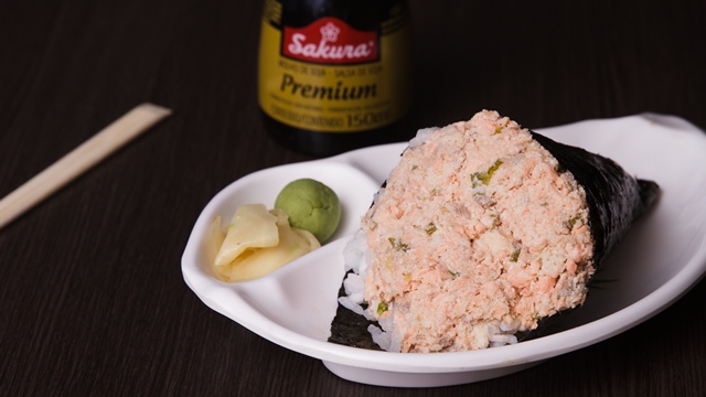 Sushie Japonese: Temaki de Salmão grelhado com cream cheese e cebolinha/Av. Dr. Antônio Gomes de Barros, 545 1º andar – Jatiúca – (82) 3325-4341.