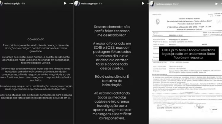 Melissa já registrou um boletim de ocorrência sobre as ameaças e todas as medidas legais estão sendo tomadas. A defesa de Bruno Mafra anunciou que irá recorrer da decisão, alegando violações ao devido processo legal e criticando o vazamento de informações do caso.