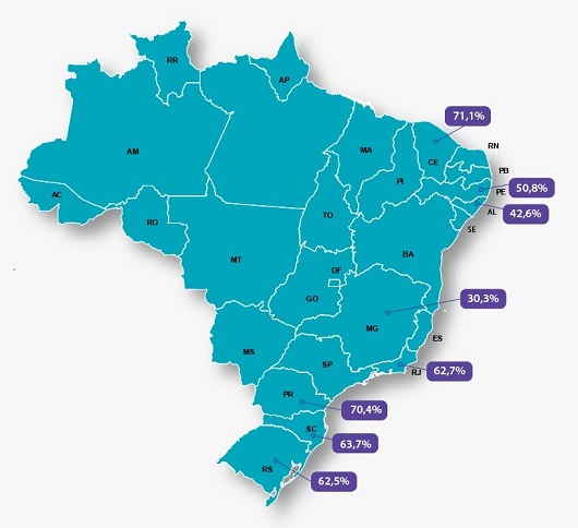 Dos oito estados avaliados neste recorte apenas dois não tiveram prevalência da mutação associada às variantes de preocupação superior a 50 %: caso de Minas Gerais, com 30,3% das amostras testadas como positivo para a mutação e, Alagoas, com 42,6%. Nos demais estados, mais de 50% das amostras foram identificadas com a mutação associada às ‘variantes de preocupação’, conforme o mapa abaixo.