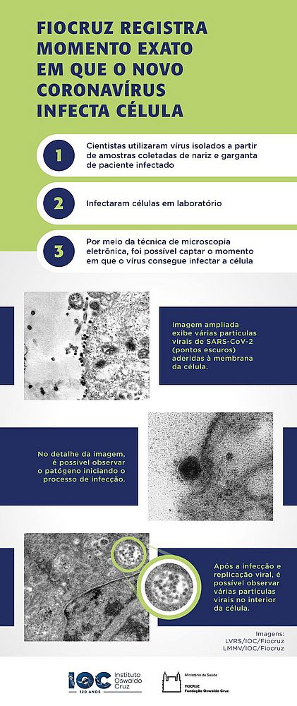 "Conseguimos verificar por análises de microscopia eletrônica todas as etapas da replicação do Sars-cov-2 em células vero", afirma a pesquisadora, que descreve que as imagens mostram o vírus entrando na célula e espalhando suas partículas no interior dela. Estudos que serão divulgados posteriormente vão mostrar também partículas infectivas captadas saindo da célula.