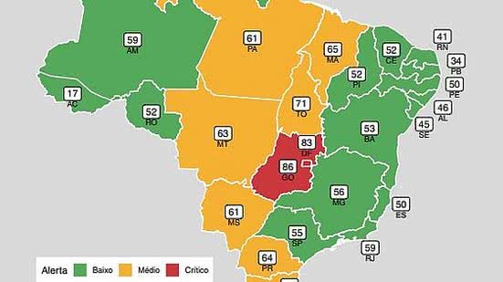 Quedas de pelo menos cinco pontos percentuais no indicador foram registradas em vários estados: Rondônia (62% para 52%), Amazonas (66% para 59%), Tocantins (77% para 71%), Ceará (59% para 52%), Rio Grande do Norte (49% para 41%), Pernambuco (58% para 50%), Alagoas (54% para 46%), Bahia (60% para 53%), São Paulo (62% para 55%), Paraná (72% para 64%), Santa Catarina (79% para 64%), Rio Grande do Sul (70% para 65%), Mato Grosso do Sul (66% para 61%) e Mato Grosso (70% para 63%). Exceto pelo Maranhão, o Nordeste está fora da zona de alerta, assim como todos os estados do Sudeste e os estados de Rondônia, Acre, Amazonas e Amapá, na região Norte. O Sul e os estados do Mato Grosso do Sul e Mato Grosso, do Centro-Oeste, se mantiveram na zona de alerta intermediário, mas com significativas quedas no indicador.