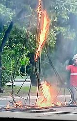 Um incêndio em um emaranhado de fios chamou atenção e assustou quem passava pela Avenida Fernandes Lima, no bairro Farol, na manhã desta sexta-feira (25).