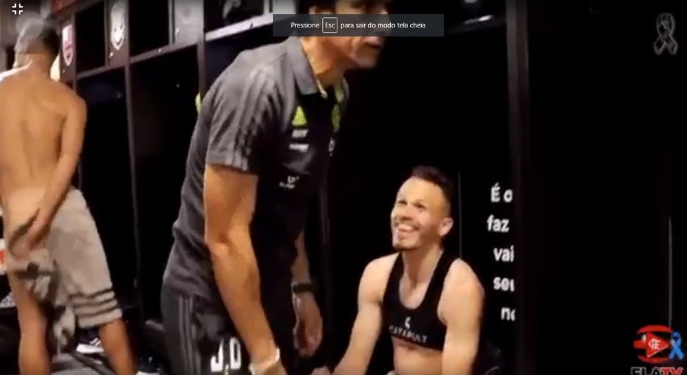As imagens mostram o auxiliar técnico João de Deus conversando com o lateral-esquerdo Renê. Ao fundo, aparece Marí de costas se enxugando com a toalha -em determinado momento, ele fica nu.