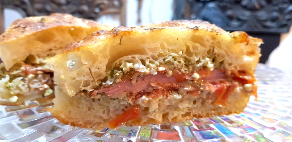 Detalhe do sanduba de foccacia de fermentação com mortadela, molho pesto e tomate confitado