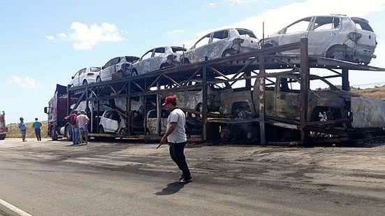 Um caminhão-cegonha que seguia pela AL-101 Sul, no trecho que pertence ao município de Jequiá da Praia, pegou fogo na manhã desta terça-feira (19) e as chamas atingiram nove veículos da marca Volkswagen que estavam no reboque. Ninguém ficou ferido.
