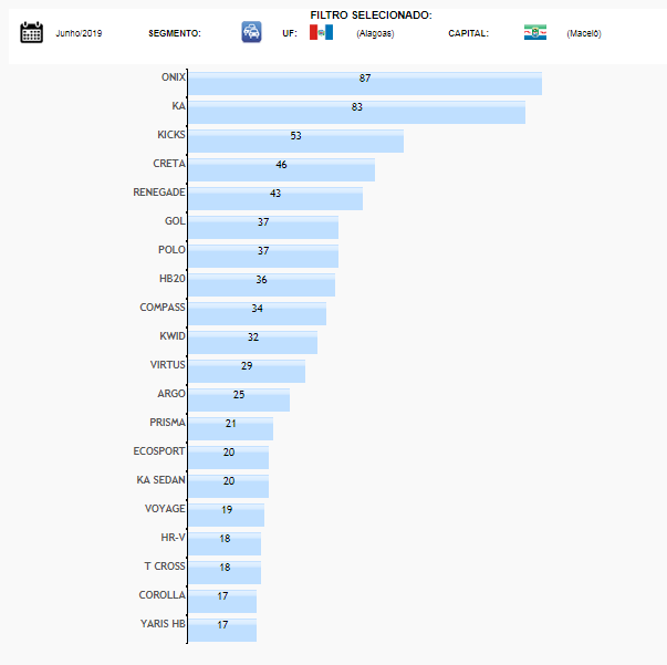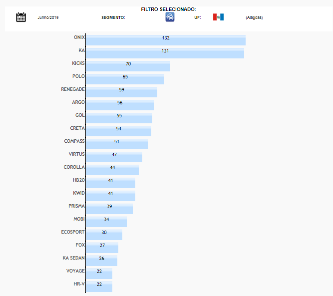 A briga pela liderança de vendas em Alagoas continua acirrada. Em junho, mais uma vez GM Onix e Ford Ka disputaram carro a carro. Depois de três meses desbancando o líder nacional, em junho o Ford Ka perdeu a briga por apenas 1 carro.