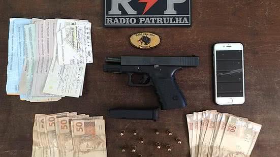 Após ser preso, a polícia cumpriu o mandado de busca na chácara, onde encontrou uma pistola calibre 380 com um carregador repleto de munições. Além da arma, folhas de cheque de diferentes bancos e valores, um IPhone 6 de cor branca e R$ 2 mil em espécie.