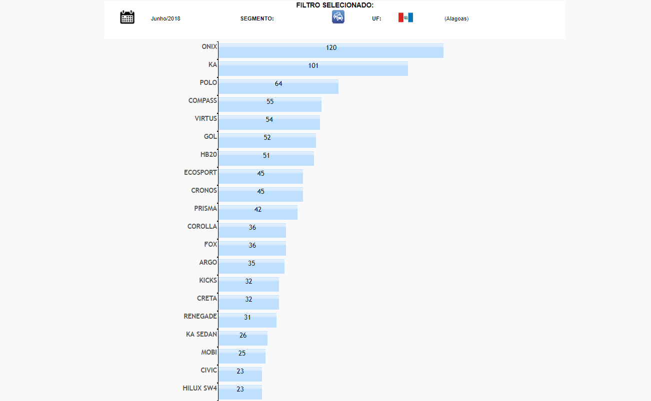 Computando os números de emplacamentos em todo o estado, o Onix fechou com folga na liderança, 19 carros a mais que o Ford Ka, segundo colocado. O Onix emplacou 120 unidades e o Ka 101. No ranking estadual o VW Polo terminou junho em 3º com 64, o Jeep Compass na 4ª com 55 e o VW Virtus na 5ª com 54 unidades.