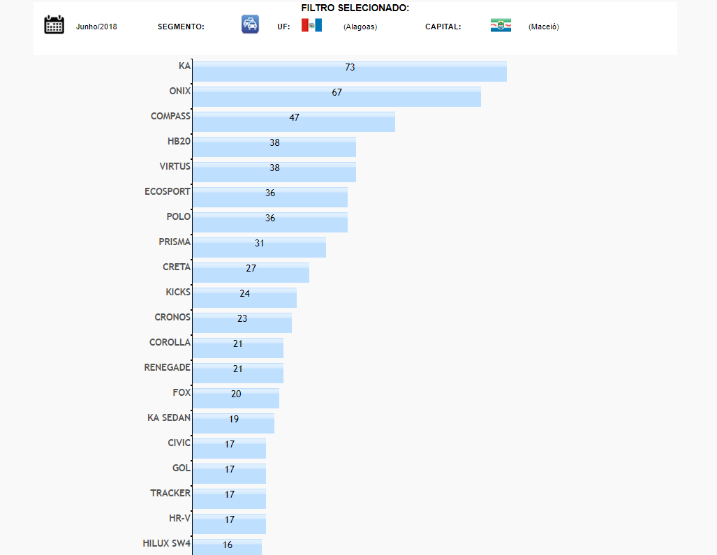 O que já era previsto nos meses anteriores foi confirmado em junho: o Ford Ka superou o então líder de vendas o GM Onix na capital alagoana. A diferença na vitória foi de seis carros. Enquanto o modelo da Chevrolet emplacou 67 veículos em Maceió, o Ford Ka emplacou 73.