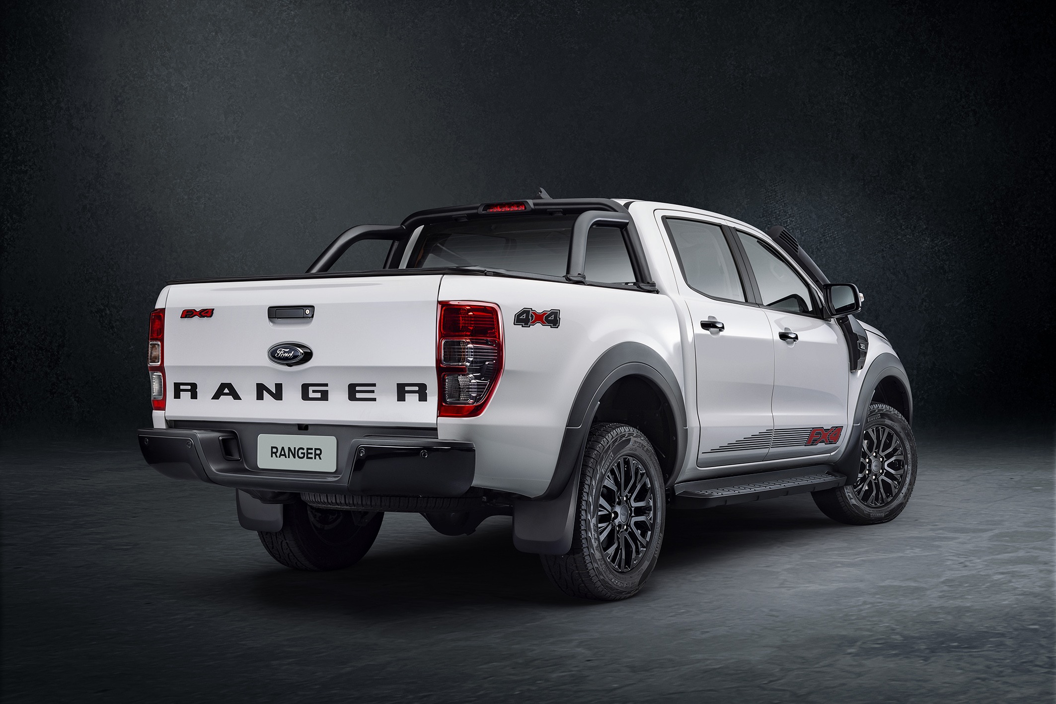 A traseira exibe um distintivo vermelho FX4 em alto relevo e o nome Ranger em letras grandes totalmente em preto – outra característica única na linha. As lanternas têm máscara escurecida. O para-choque traseiro, assim como os retrovisores e maçanetas, são em preto brilhante.