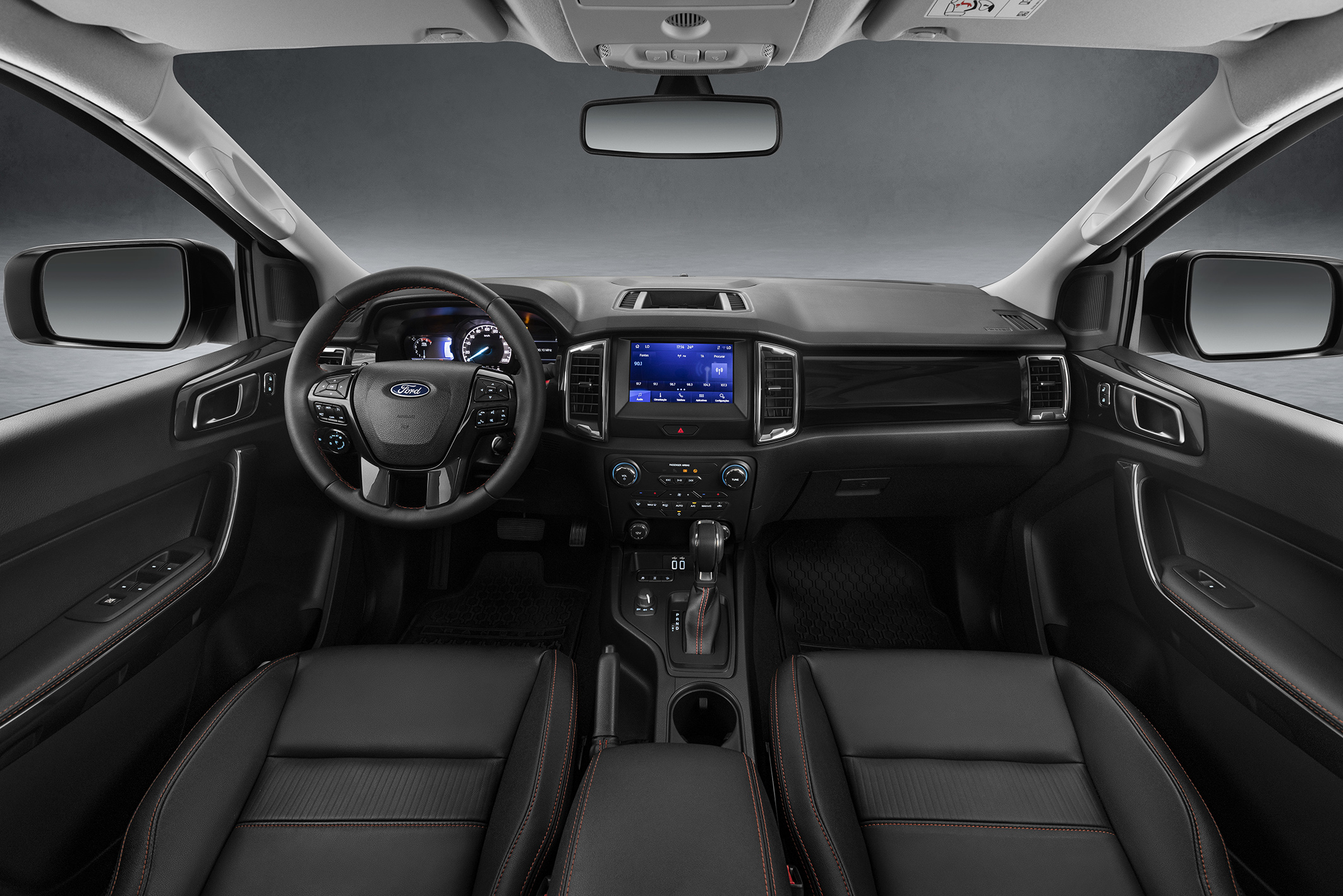 Entre os itens de conforto, a picape oferece ar-condicionado digital de dupla zona, banco do motorista com ajuste lombar e elétrico, sensor de chuva, painel com duas telas de LCD, central multimídia SYNC com tela de 8 polegadas, acesso a Android Auto e Apple CarPlay e assistente de fechamento da tampa da caçamba.