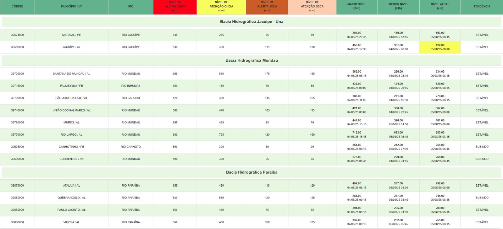 Ainda segundo a Secretaria do Estado do Meio Ambiente e Recursos Hídricos de Alagoas, o rio que aparece no boletim com tendência de elevação dos rios é o rio Paraíba na cidade de Quebrangulo. No entanto, a elevação está em 246 cm e o nível de atenção é somente com 580 cm, já o nível de cheia é após ultrapassar 680 cm. Confira a situação: