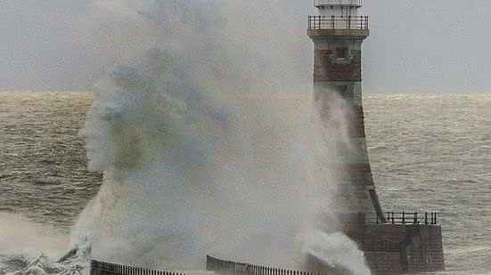 Um fotógrafo ficou surpreso ao capturar a forma de um rosto humano em uma onda quebrando em um farol na costa do Reino Unido.