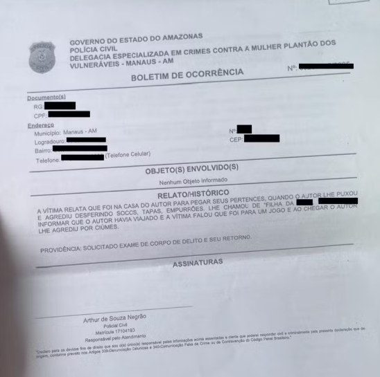 O árbitro assistente do quadro de arbitragem da Federação Amazonense de Futebol (FAF), Hugo Agostinho Chaves da Paixão, é acusado de agredir a ex-namorada, Joice de Souza, de 22 anos, que atua como zagueira pelo Manaus, no Campeonato Amazonense Feminino. A denúncia foi feita pela própria jogadora em seu perfil nas redes sociais nesta segunda-feira (08).