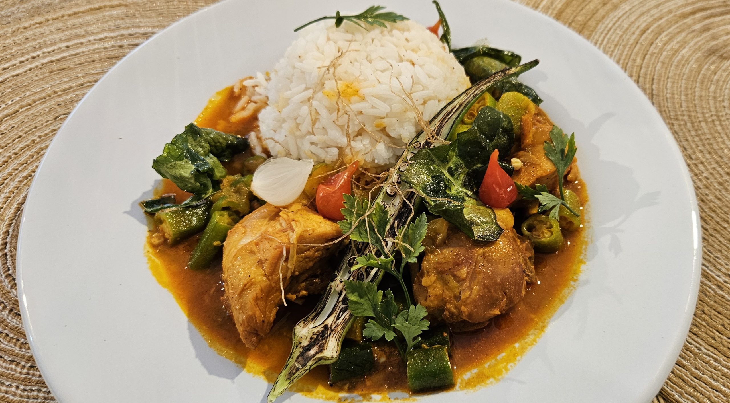 E a gente come com os olhos… o frango com quiabo vem tão jeitoso que até dá dó de comer. A couve crocante quebra de sabor no céu da boca, o quiabo cortado ao meio é elegante, o arroz com alho perfeito. Hum!!! Bonito de ser ver e delicioso de comer, a tradição do franguinho bem macio no seu próprio molho de cozimento.