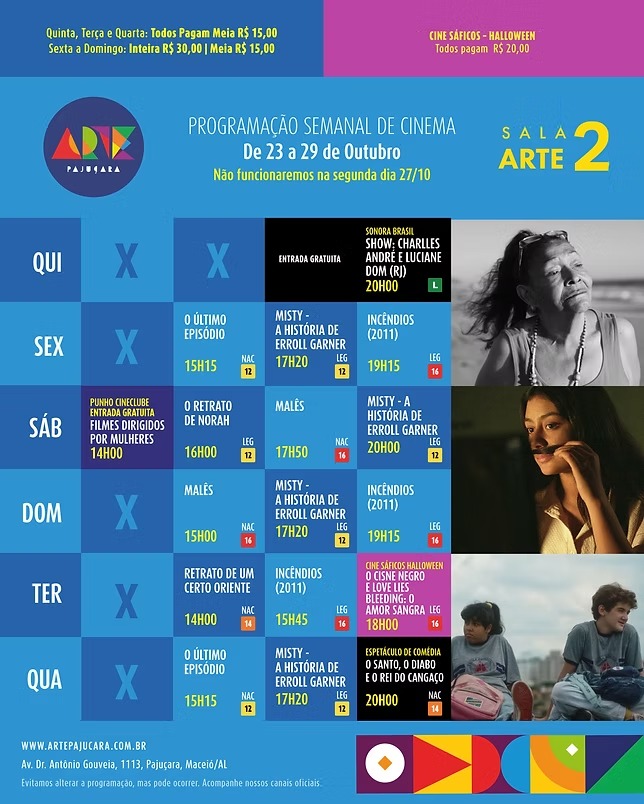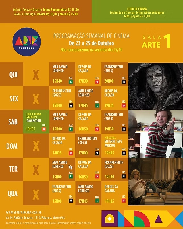 Para conferir a programação completa de todos os filmes em cartaz no Arapiraca Partage Shopping, Centerplex (Shopping Pátio Maceió), Cinesystem (Parque Shopping) e Kinoplex (Maceió Shopping): basta clicar aqui. Já para o Shopping da Vila, em Delmiro Gouveia, pode ser conferida aqui.