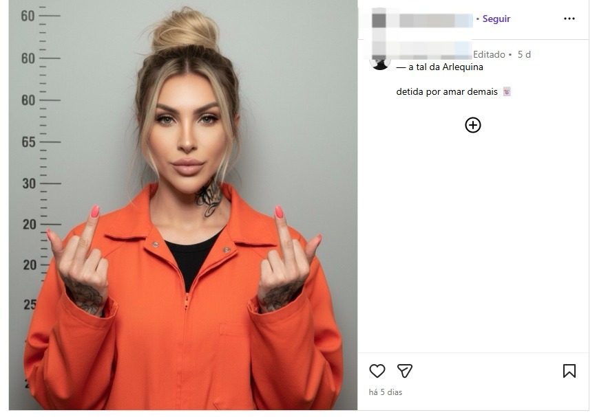 Na última semana, a modelo continuou brincando com o caso. Ela fez uma montagem com o rosto dela e roupas de detentas, usando Inteligência Artificial, e colocou na legenda: “Detida por amar demais”. Confira: