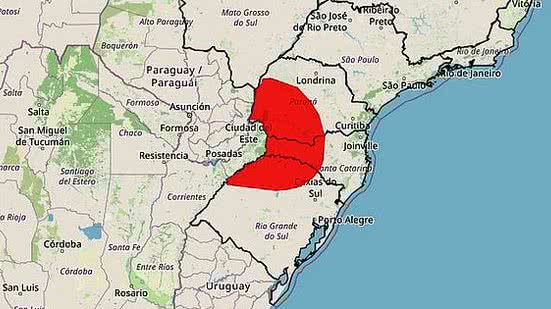 O Instituto Nacional de Meteorologia (Inmet) emitiu alerta vermelho para áreas do norte do Rio Grande do Sul, centro-oeste de Santa Catarina e sudoeste do Paraná, devido à previsão de chuva superior a 100 milímetros (mm) em 24 horas. Até a noite deste sábado (4), a previsão é que as chuvas passem de 200 mm nessas áreas.