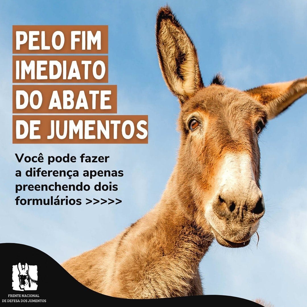 O jumento, um dos maiores símbolos da cultura e dos costumes brasileiros, está ameaçado! Junte-se e ajude a divulgar esse absurdo! Infelizmente, a estimativa é que cerca de 600 mil jumentos tenham sido abatidos desde 2016, desde que a prática foi iniciada. Atualmente, há em torno de de 300 mil espécimes no Nordeste, que quando capturados sofrem maus-tratos e causam risco sanitário aos humanos.