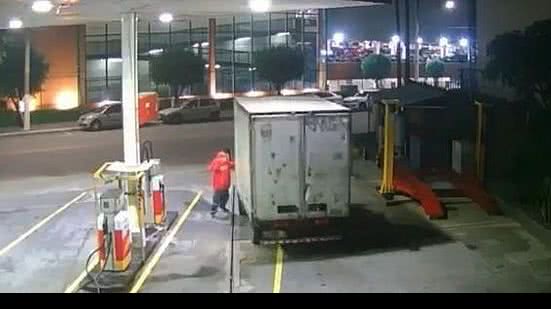 • O caminhoneiro abastecia quando uma discussão começou. Ele arrancou com o veículo, levando o funcionário do posto, mostram imagens de câmeras de segurança;