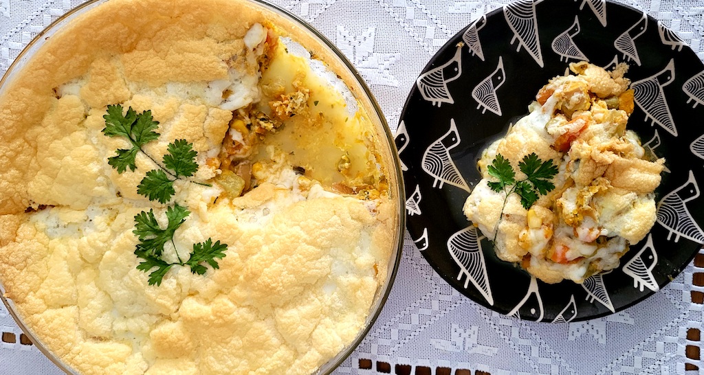 Misture três colheres da clara em neve com os legumes. Acrescente o queijo coalho ralado em cima dos legumes e cubra com as claras em neve. Decore com tomate e coentro.