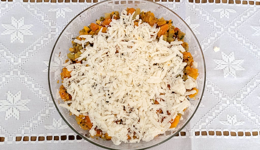Primeiro coloca os legumes refogados e em seguida o queijo coalho