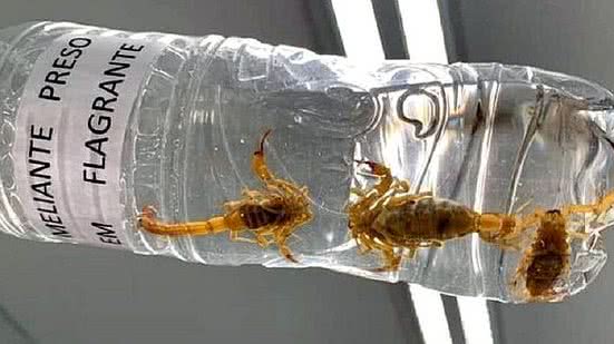 Imagens com os três escorpiões em uma garrafa pet foram compartilhadas hoje entre os funcionários do Senado. Após a captura, eles fizeram uma brincadeira e afixaram a mensagem "Meliante preso em flagrante" no recipiente.