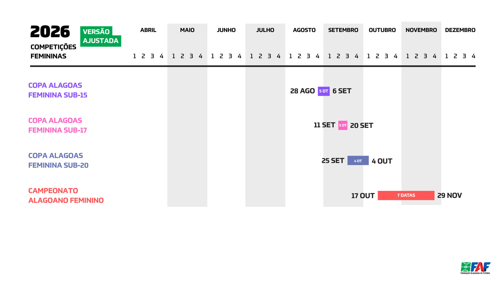 Nesta temporada, serão disputadas a Copa Alagoas Feminina nas categorias sub-15, sub-17 e sub-20, além do Alagoano Feminino adulto. Também foram apresentadas as vagas destinadas às equipes alagoanas em competições nacionais.
