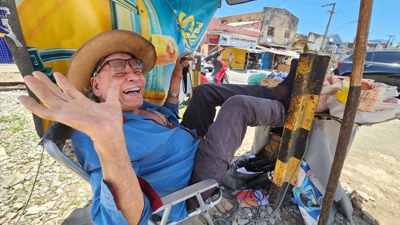 Refestelado numa cadeira de praia, com as pernas para o alto e um sorriso metálico e largo, ele projeta a voz com o auxílio de um prosaico sistema de som, composto por microfone, amplificador e corneta. “Venha, venha na carreira; venha correndo, mas com o dinheiro na mão. Só que tem que pegar na fila e esperar que eu vou atender todo mundo”, anuncia o Galego do Veneno, mesmo sem nenhuma “alma” perfilada.