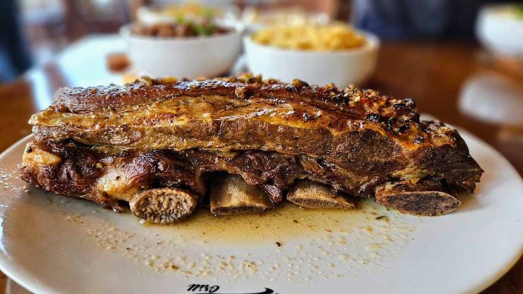 Já a costela bovina é outro espetáculo, com suas gordurinhas generosas que desmancham no céu da boca. A carne vem de um frigorífico da cidade baiana de Paulo Afonso. Ela leva quatro horas no forno e, depois, vai à churrasqueira. É temperada apenas com sal e vinagrete.