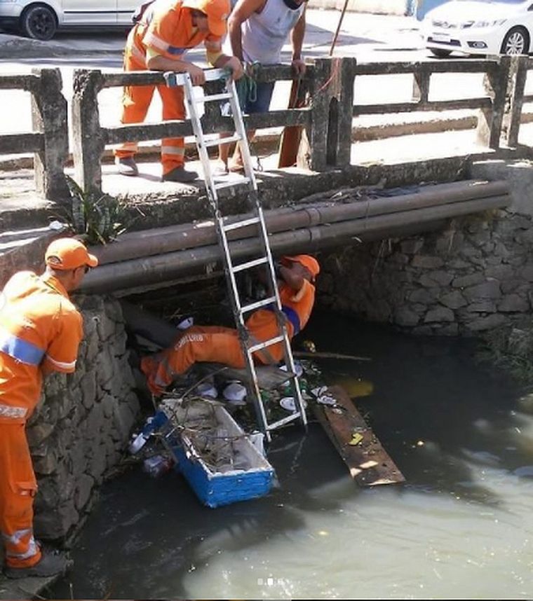 Uma cachorrinha passou por apuros na manhã desta sexta-feira (16) ao ser jogada em um valão na Rua Limites, em Realengo, na Zona Oeste do Rio. Moradores acionaram garis da Comlurb, que estavam perto do local, e eles fizeram o resgate.
